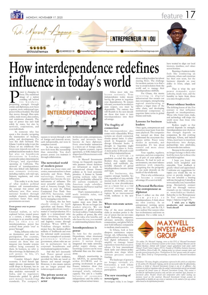As someone who has spent a few decades navigating the intersection of business, policy, and development, I’ve seen this shift firsthand. The Ghana I work in today is not the Ghana of my childhood. Our future now depends not only on political decisions made in Accra but also on boardroom discussions in London, commodity prices determined in Chicago, and algorithms operating in California. The network of interdependence that once linked only diplomats now connects everyone, including traders, tech start-ups, farmers, regulators, and even influencers.